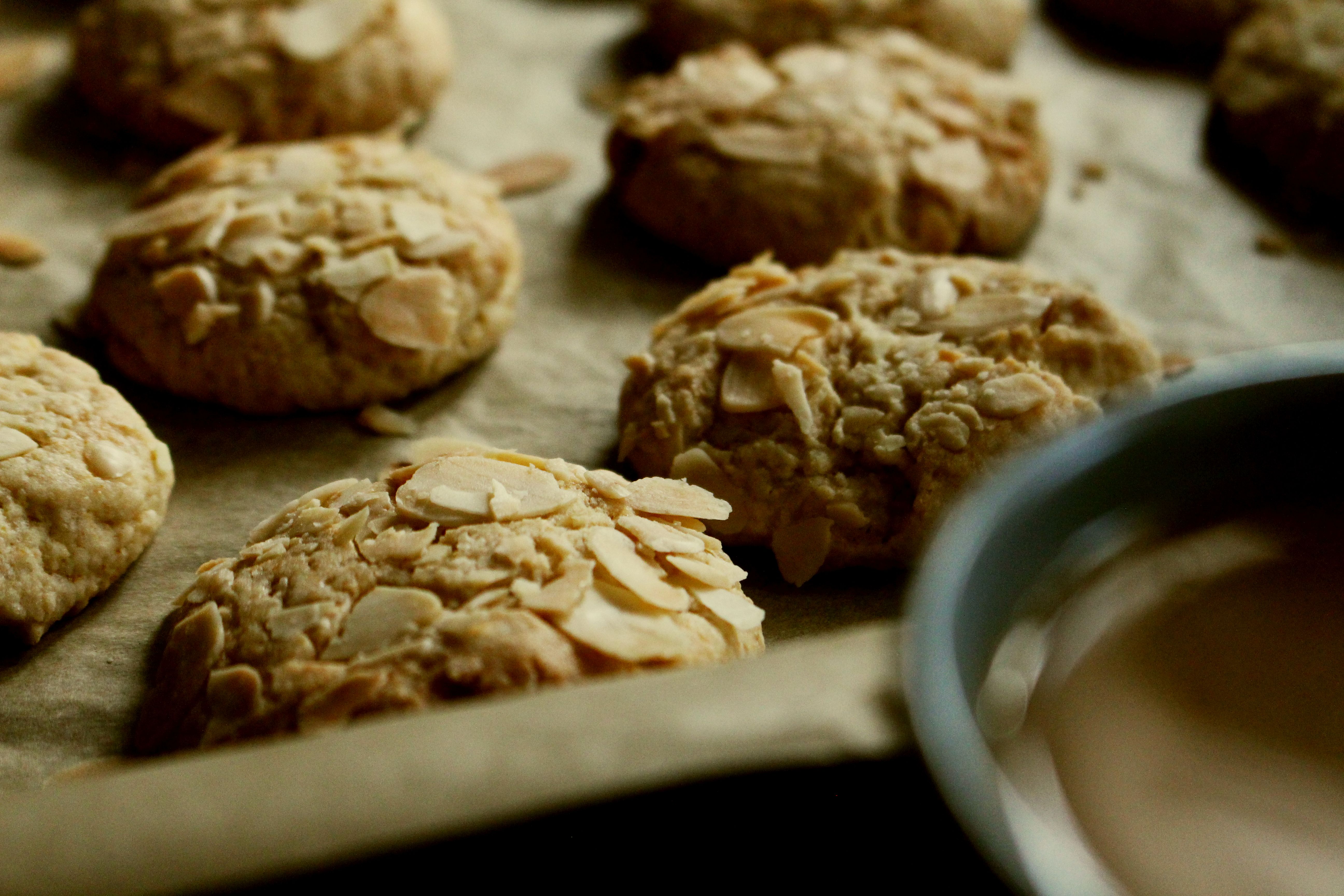 Die Kekse mit der Mandelseite nach oben auf das Backblech legen (sie können recht nah beieinander liegen, weil sie kaum aufgehen) und 20-22 Minuten backen. Voilá!