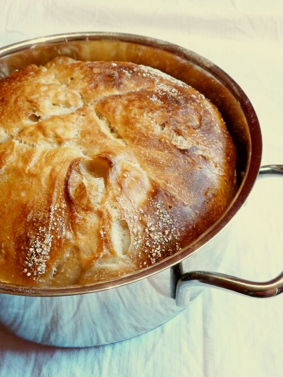 Nach der zweiten Geh-Zeit einen feuerfesten Topf (d.h. ohne Plastikgriffe o.ä.) auf ein Backblech im unteren Drittel des Ofens auf ein Blech stellen und den Ofen auf 250 °C incl. Topf vorheizen. Sobald die Temperatur erreicht ist, den Teig aus der Schüssel herausnehmen, bei Bedarf noch etwas Mehl dazu verwenden, und dann den Topf aus dem Ofen nehmen (VORSICHT, sehr heiß!). Jetzt den Teig-Rohling schnell in den Topf setzen und an der Oberfläche kreuzweise mit einem Messer einschneiden (Wenn man diesen Schritt vergisst, sieht das Brot aus wie auf dem Topf-Foto. Auch nicht so schlimm, also). Dann den Topf mit dem Deckel verschließen (und darauf achten, dass er wirklich sitzt), zurück in den Ofen stellen und für 30 Minuten backen. Danach den Deckel entfernen und das Brot für weitere ca. 20 Minuten backen. Das Brot aus dem Ofen nehmen, ca. 30 Min. auskühlen lassen, danach aus dem Topf kippen. Man kann das Brot leichter schneiden, wenn man dann noch etwas wartet, aber das klappt appetitbedingt fast nie…