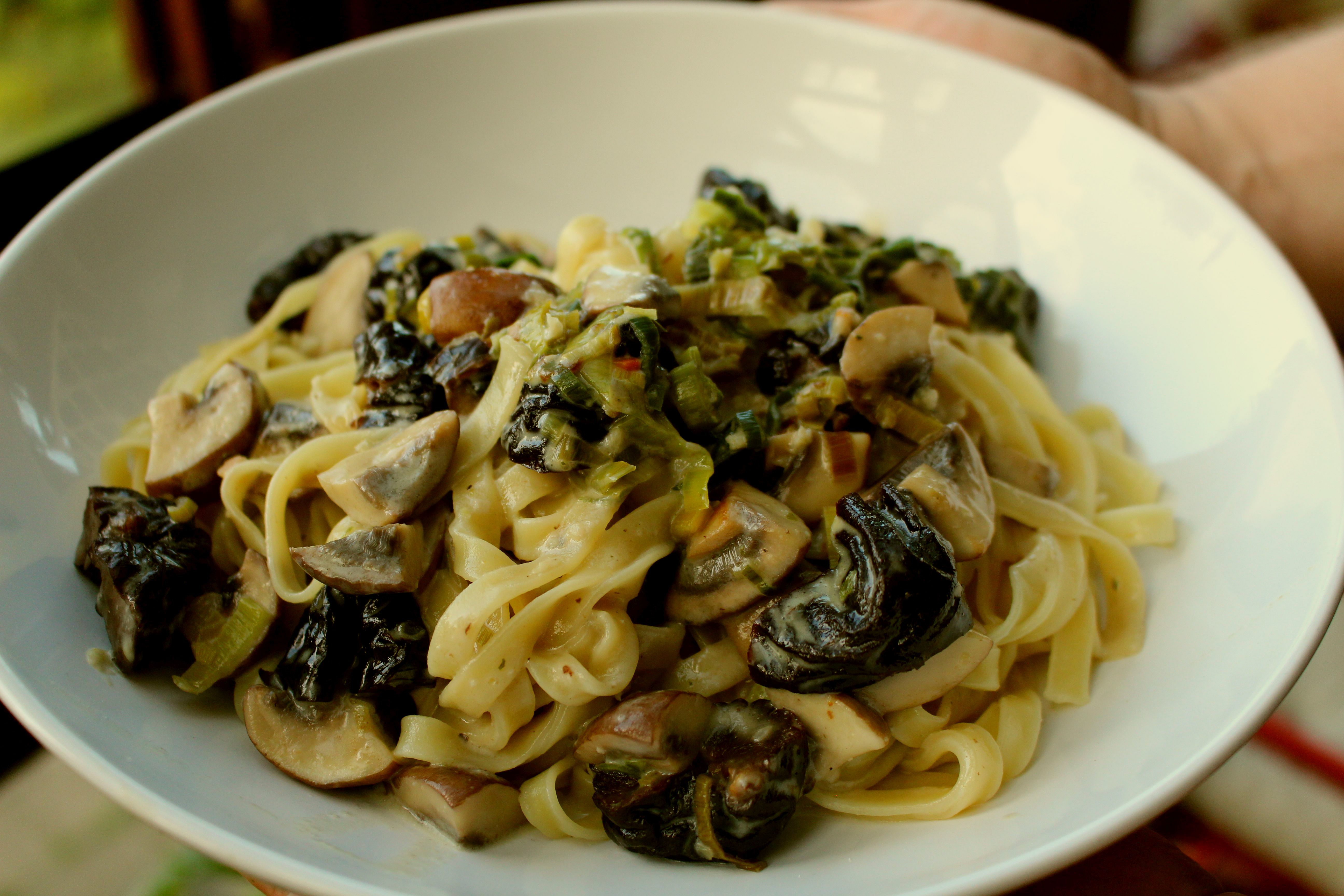 Die Pilze mit dem Porree sowie mit zwei gepressten Knoblauchzehen in ca. 2 EL Margarine in einer großen Pfanne anschwitzen, dann leicht anbraten. Nach ca. 8-10 Min. mit 200ml cremiger Kokosmilch ablöschen, 1 TL Gemüsebrühe dazugeben. 350g vegane Tagliatelle maximal 6 Min. im Salzwasser kochen. 150g Trocken-/Backpflaumen halbieren oder ggf. vierteln und zum Gemüse geben, gut durchrühren. Die Nudeln abschütten und sofort in die Sauce einrühren. Mit Salz und Pfeffer abschmecken & servieren.