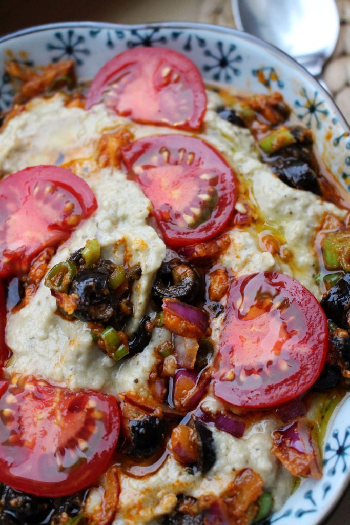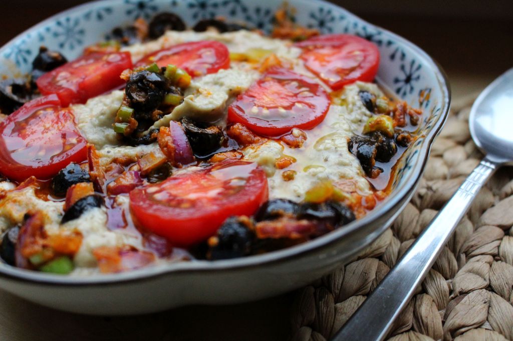 Für das Topping habe ich neben den Cocktailtomaten eine feingeschnittene Lauchzwiebel, eine fein gewürfelte halbe rote Zwiebel, einige schwarze Oliven sowie einen TL Pesto rosso verwendet.
