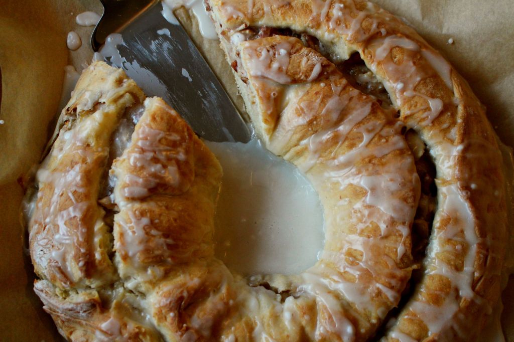 Den Ofen auf 180 Grad (O-/U-Hitze) vorheizen. Den Teig auf einer bemehlten Arbeitsfläche zu einem Rechteck (ca. 25x40cm) ausrollen. Dann wird der Teig mit dem Apfelmus und den Nüssen gleichmäßig bestreut/bestrichen und vorsichtig der Länge nach zu einer Rolle aufgedreht. Die beiden Ende der Rolle miteinander verbinden und den Kranz auf ein Backblech legen; einmal mittig einschneiden und ca. 30-40 Minuten im Ofen backen. Anschließend auskühlen lassen, dann 125g Puderzucker mit ca. 2-4 EL Zitronensaft verquirlen, den Zuckerguss auf den Kranz auftragen.