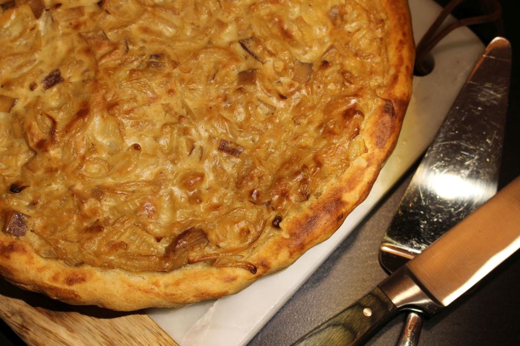 Man beginnt mit dem Hefeteig für den Boden des Zwiebelkuchens: 215g Weizenmehl mit 10-12g Salz vermengen; in einem Gefäß eine Pkg. Trockenhefe (bio schmeckt besser) mit 125ml lauwarmem Wasser und 1 EL Zucker verqirrlen. Das Hefe-Wasser in die Mehlmischung einrühren und 2 EL Olivenöl ebenfalls dazugeben. Den Teig gut kneten und ca. eine Stunde ruhen lassen.