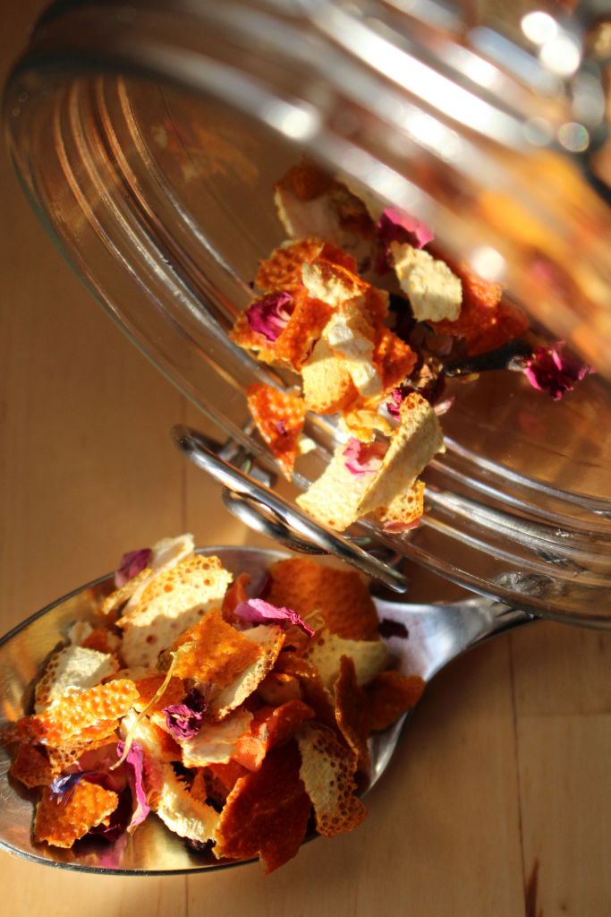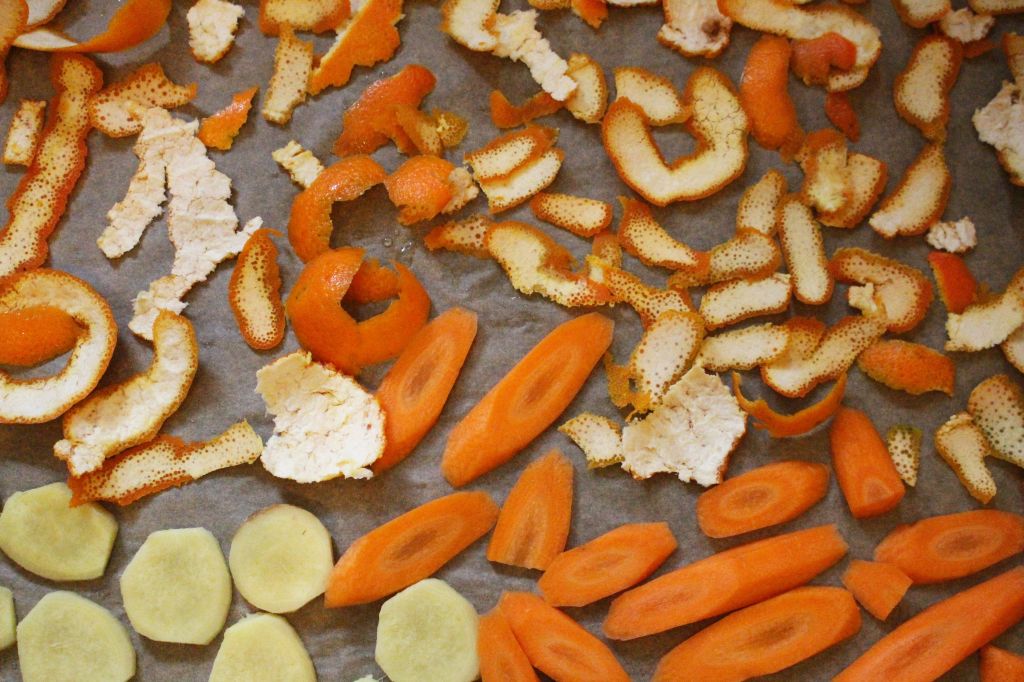 Die Schale von 7-8 unbehandelten Bio-Clementinen mit einem Schäler abschneiden. Weil die so entstehenden Schalen ohnehin sehr dünn sind, müssen sie nicht noch in kleinere Stücke geschnitten werden. Ein ca. 3-4cm großes Stück Ingwer und 3 mittelgroße Möhren schälen und ebenfalls in kleine, dünne Scheiben schneiden. Alles zusammen auf einem Backblech auslegen (die einzelnen Stücke sollten sich dabei nicht berühren, damit sie gut trocknen können). Das Blech in den Ofen schieben und bei 70-80 Grad (O-/U-Hitze) für ca. 5-6 Stunden trocknen; damit sollte ein Holzlöffel zwischen Ofen und Ofentür geklemmt werden, damit die Feuchtigkeit entweichen kann. Meine Erfahrung war, dass gerade die Ingwer- und Möhrenstücke noch ca. eine weitere Stunde, in diesem Fall über der Heizung brauchten, um wirklich trocken zu werden, während die Schalen der Clementinen bereits nach 5,5 Stunden sehr trocken waren. Diese Ungleichzeitigkeit ließe sich natürlich auch dadurch auffangen, dass Clementinen und Ingwer/Möhren auf zwei getrennten Blechen getrocknet werden.