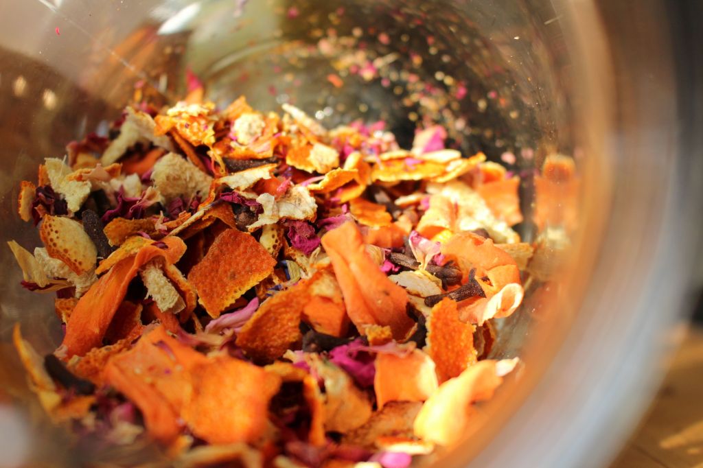 Anschließend habe ich 2 EL Nelken und 3 EL getrocknete und essbare Blüten dazugegeben; sicher würden aber auch Zimtstangen, getrocknete Cranberries und andere weihnachtliche Zutaten gut mit den anderen Bestandteilen harmonieren. Der Tee schmeckt wirklich rund und lecker! Lediglich die Menge muss gut im Auge behalten werden, denn durch das Trocknen verlieren Clementinen, Möhren und Ingwer stark an Volumen, sodass die anfängliche Menge auf dem Backblech nicht dem Endergebnis entsprechen wird.