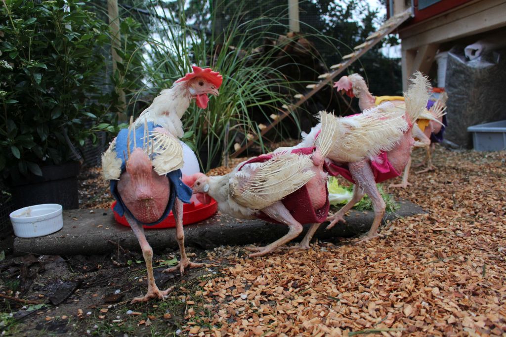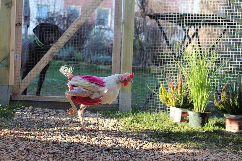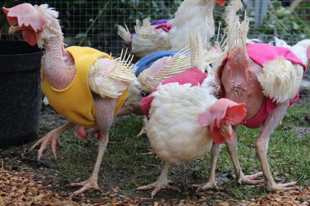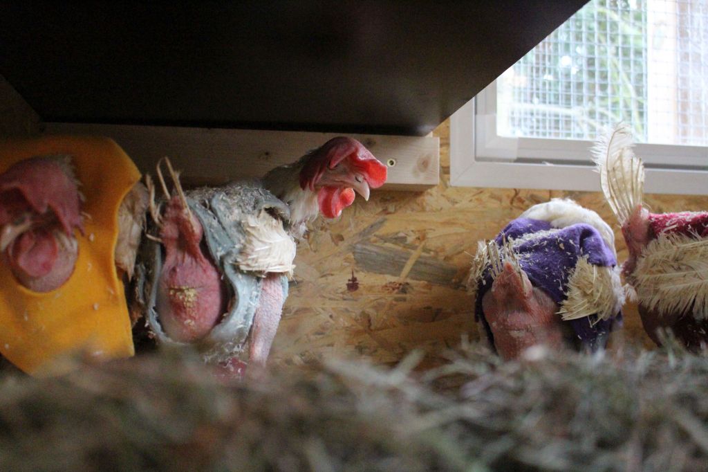 Nun ja, wer meint, dass mit der Übergabe der allermeiste Stress endlich passé gewesen wäre, irrt sich (ich habe das jedenfalls so oder ähnlich geglaubt…). Natürlich war uns klar, in welchem Zustand die Tiere sein würden; welche Auswirkungen das auf unseren Tagesablauf haben würde, war aber zunächst nicht so klar. Natürlich haben die wir die Hennen erstmal ankommen lassen, haben sie gefüttert und ihnen zu Trinken gegeben – und ihnen – immerhin war es trotz eines relativ warmen Dezembers recht kalt für die teilweise unbefiederten Tiere – die feschen Pullis angezogen, was sie selbst gar nicht so toll fanden. Die winzigen, ausgemergelten und spindeldürren Körper in den Händen zu halten, war nicht leicht. Das herausstehende Brustbeins, das sich beim Halten der Hühner in die eigenen Handinnenflächen drückt, bleibt mir wohl für immer in Erinnerung. Damals hätte ich nicht wirklich damit gerechnet, dass diese geschundenen Wesen, die trotz ihres Zustandes ganz im Takt ihrer grausamen Überzüchtung jeden Tag ein Ei legen, einmal derart lebensfroh durch den Garten laufen würden.