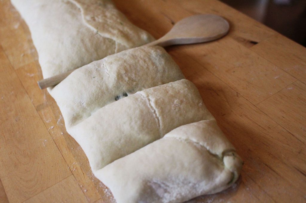 Nun wird der Teig in Form eines Rechtecks möglichst dünn auf einer leicht bemehlten Arbeitsfläche ausgerollt; mein Rechteck war ca. 30x45cm groß. Die Füllung darauf verteilen und jeweils zu den Seiten einen ca.2cm Rand freilassen, der dann mit Wasser bestrichen wird. Den Teig der Länge nach aufrollen und die Seiten sorgfältig verschließen. Die so entstandene Rolle wird dann mit dem runden Griff eines Holzlöffels an den Stellen eingedrückt, die die Enden der Spinattaschen bilden sollen – man kann also entscheiden, wie groß die Taschen jeweils sein sollen. Die eingedrückten Stellen dann mit einem Messer einschneiden.