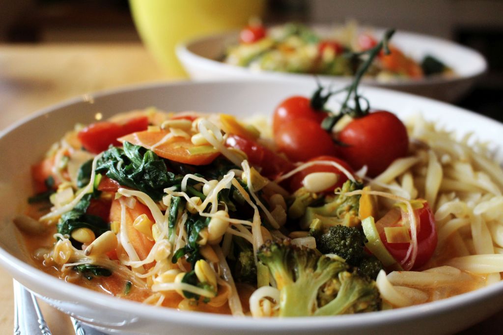 Unterdessen eine große Zwiebel würfeln, 2 cm Ingwer kleinraspeln, einen Brokkoli sowie 4 mittelgroße Möhren in Stücke schneiden und alles zusammen in 3 EL Olivenöl in einer großen Pfanne anschwitzen; nach ca. 3-4 Minuten 4 EL Paprikamark dazugeben und mit ca. 300ml Wasser ablöschen und für 6-8 Min. köcheln lassen. 400ml Kokosmilch dazugeben und weitere 5 Min. köcheln lassen. Danach ein Glas Sojasprossen, 2 Hände voll Kirschtomaten sowie 100g Rucola unterrühren. Mit Salz und Pfeffer und einem guten Schuss Limettensaft (od. Zitronensaft) abschmecken, gut durchrühren und mit dem Trofie sowie einigen Pinienkernen servieren!