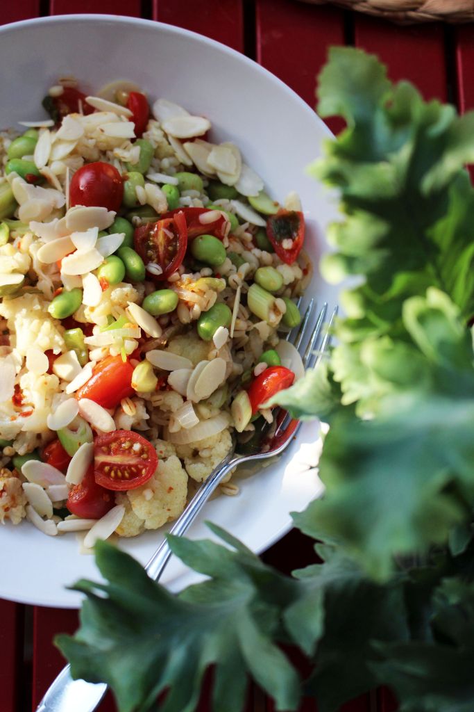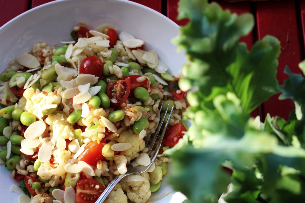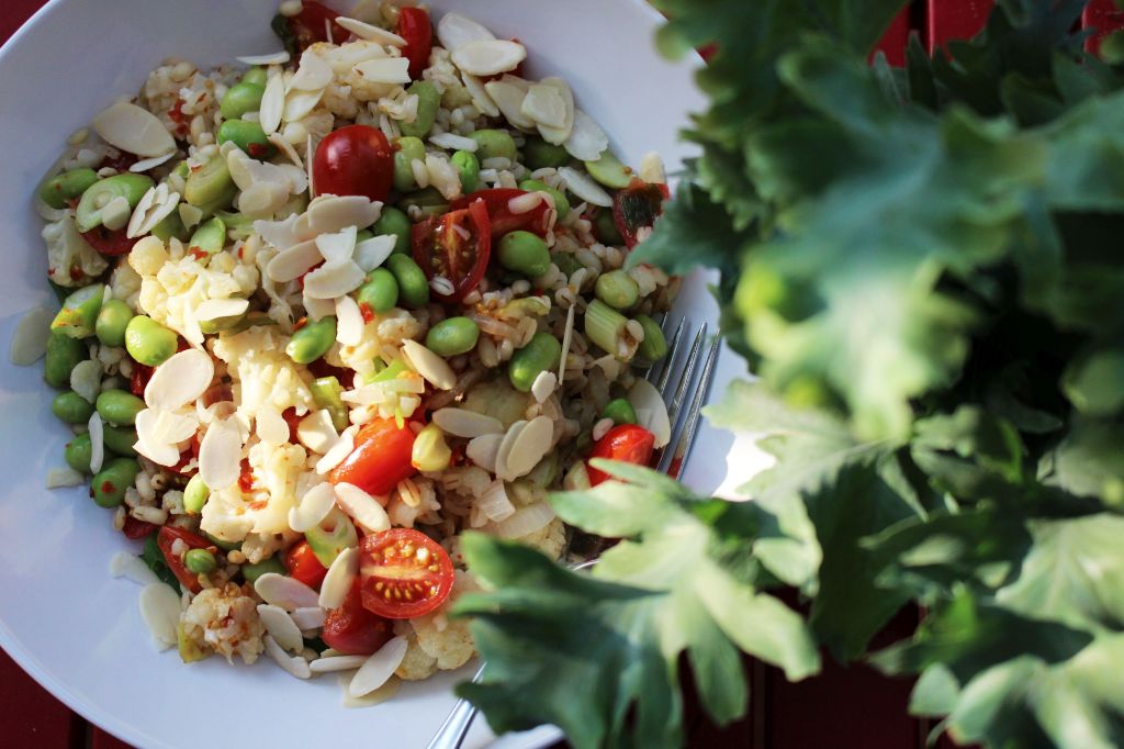 Zwei Zwiebeln in feine Streifen schneiden und in 4 EL Olivenöl in einer großen Pfanne andünsten; die Röschen eines mittelgroßen Blumenkohls dazugeben, ebenso 250g Gerstengraupen, 1 EL Tomatenflocken sowie ½ TL Chiliflocken. Alles gut durchrühren und für ca. 3 Min. in der Pfanne dünsten. Dann das Ganze mit Wasser ablöschen, bis die Pfanne zu ca. ¾ gefüllt ist. Das Gemüse und die Gerste dann für ca. 15 Min. köcheln lassen, immer mal wieder umrühren. Anschließend ca. 300g TK-Edamame dazugeben, gut durchrühren, und weitere 5 Min köcheln lassen. Wenn der Blumenkohl noch nicht weich ist, ggf. etwas mehr Wasser dazugeben. Dann 250g halbierte Kirschtomaten und 3 in feine Scheiben geschnittene Lauchzwiebeln unterheben. Die Hitze abstellen und das Gericht ca. 5 Min. ziehen lassen. Anschließend mit Salz und Pfeffer sowie etwas Zitronensaft abschmecken – ein paar gehobelte Mandeln dazugeben und fertig ist’s!