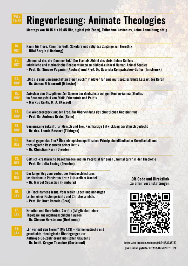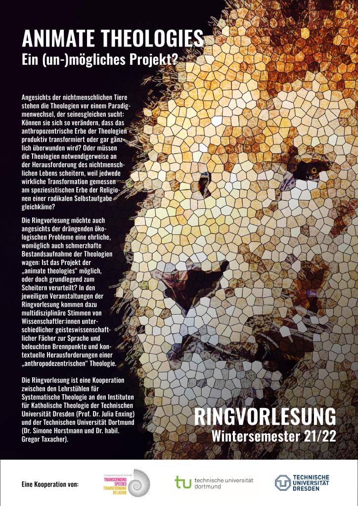Im kommenden Wintersemester findet die Ringvorlesung ANIMATE THEOLOGIES statt: Gemeinsam mit Julia Enxing und Gregor Taxacher habe ich die Reihe organisiert – herzliche Einladung an alle Interessierten! Die Vorträge finden ab dem 18.10. jeweils ab 18 Uhr statt! Alles weitere unten: