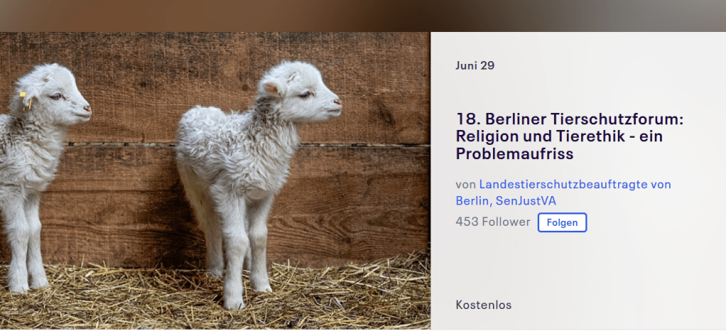 Im Juli werde ich im Rahmen des 18. Berliner Tierschutzforum einen Vortrag zum Thema „Wenn Religion für Tiere zum Problem wird“ halten – herzliche Einladung dazu, über Eventbrite kann man sich schnell und kostenfrei dafür anmelden, um am 29. mitdiskutieren zu können. Die Landestierschutzbeauftragte von Berlin, Dr. Kathrin Herrmann, ist Ausrichterin des Tierschutzforums.
