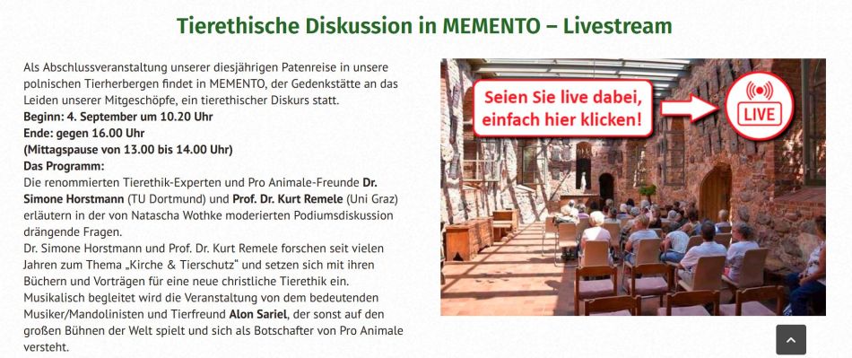 Auf dieses Event freue ich mich bereits seit Monaten: Vom 01. bis zum 04. September darf ich die Patenreise der wunderbaren Tierschutz-Orga Pro Animale begleiten: Pro Animale hat (u.a.) in Polen beeindruckende Lebenshöfe und Tierherbergen eingerichtet, die Zufluchtsstätten tausender Tiere sind, die dort ein liebevoll gestaltetes Zuhause gefunden haben. Am 04. September besuchen wir die Erinnerungsstätte „Memento“ – eine ehemalige Kirche, die von Pro Animale zur Gedenkstätte an das Leiden der Tiere umfunktioniert wurde. Dort werde ich gemeinsam mit Natascha Wothke von Pro Animale und Prof. Kurt Remele von der Uni Graz über wesentliche tierethische Fragen sprechen. Dieser Dialog wird live gestreamt – wer dabei sein mag, kann sich hier dazuschalten: