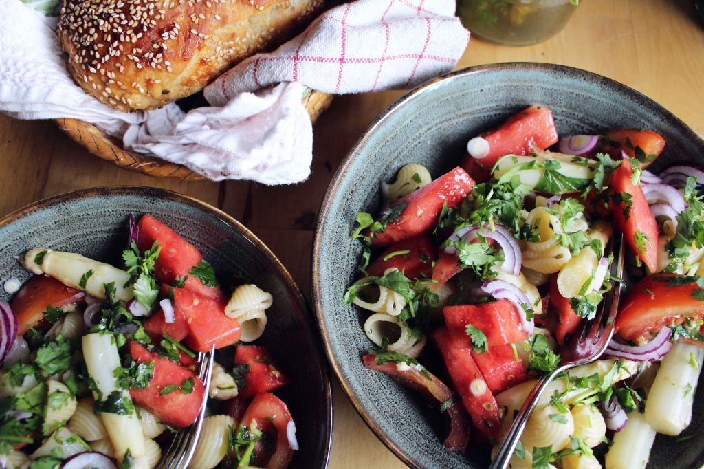 Unterdessen eine kleine halbe Melone und drei Tomaten in mundgerechte Stücke schneiden. Einen Bund Koriander hacken, eine kleine rote Zwiebel in feine Halbringe schneiden.