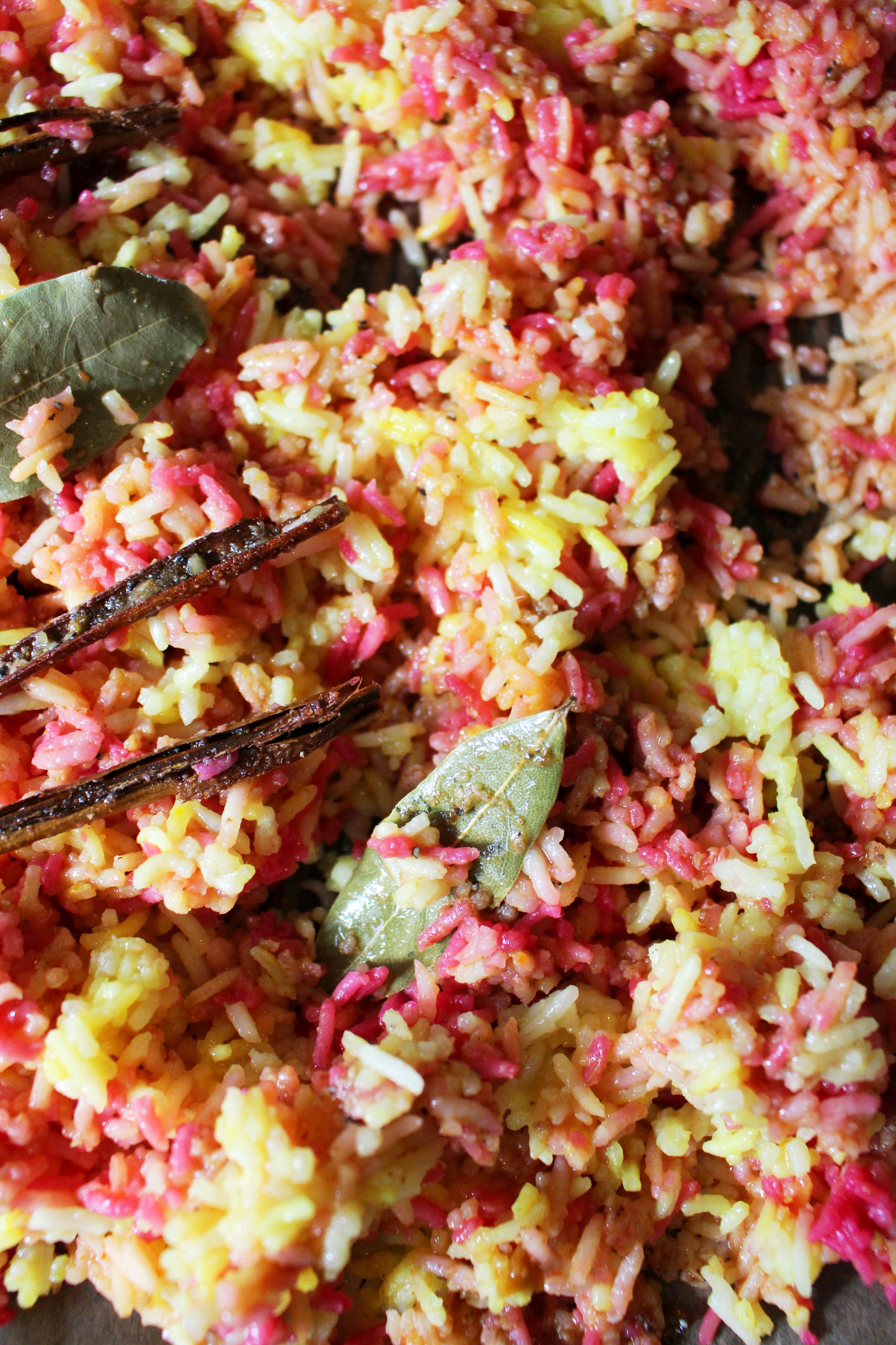 Rezepte, die ebenso einfach wie kulinarisch genial sind, gehören zu den Juwelen jeder Küche. Indische Biryanis sind vielleicht das beste Beispiel dafür. Man kann sich dabei trefflich streiten, welche Zutaten und Beilagen unbedingt rein müssen (mit Blumenkohl? mit Brokkoli?) und welche Zubereitungsweise die „authentische“ ist. Dieses Biryani jedenfalls wird gekocht und gebacken – so entfalten sich die wunderbaren, samtigen Gewürze gleich doppelt. Und durch den gefärbten Reis isst das Auge ebenfalls mit, sodass man ihm fairerweise auch eine Teilschuld an der übermäßigen Kalorienaufnahme zuschreiben sollte 😉