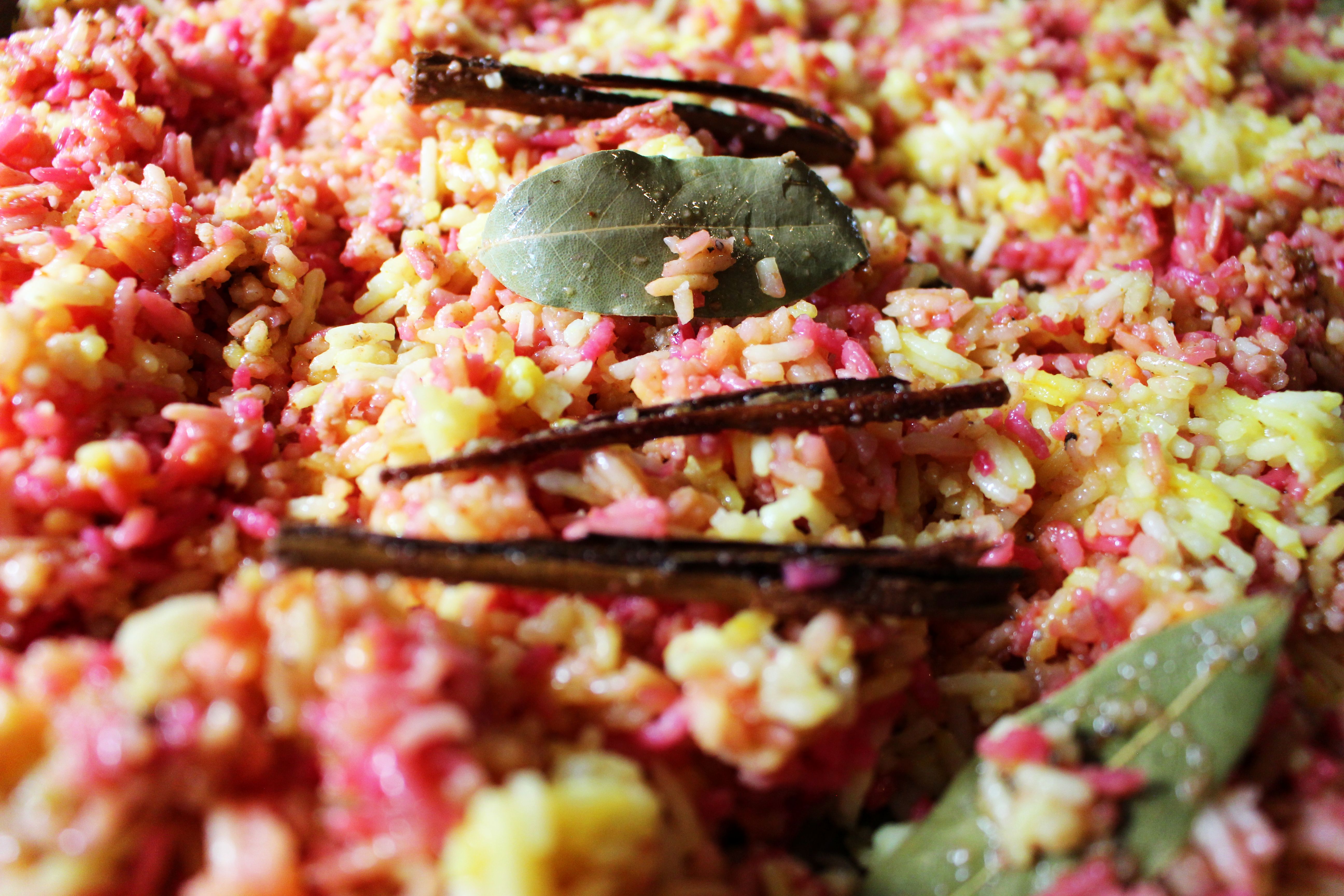 Ein Backblech mit Backpapier auslegen und den Reis darauf verteilen, die unterschiedlichen Farben mischen. Dann wird die Gewürzmischung über dem Reis verteilt. Alles gut durchrühren, sodass der gesamte Reis mit der Mischung überzogen ist. Bei Bedarf nochmal salzen. Anschließend wird der Reis im Ofen ca. 20 Minuten gebacken.