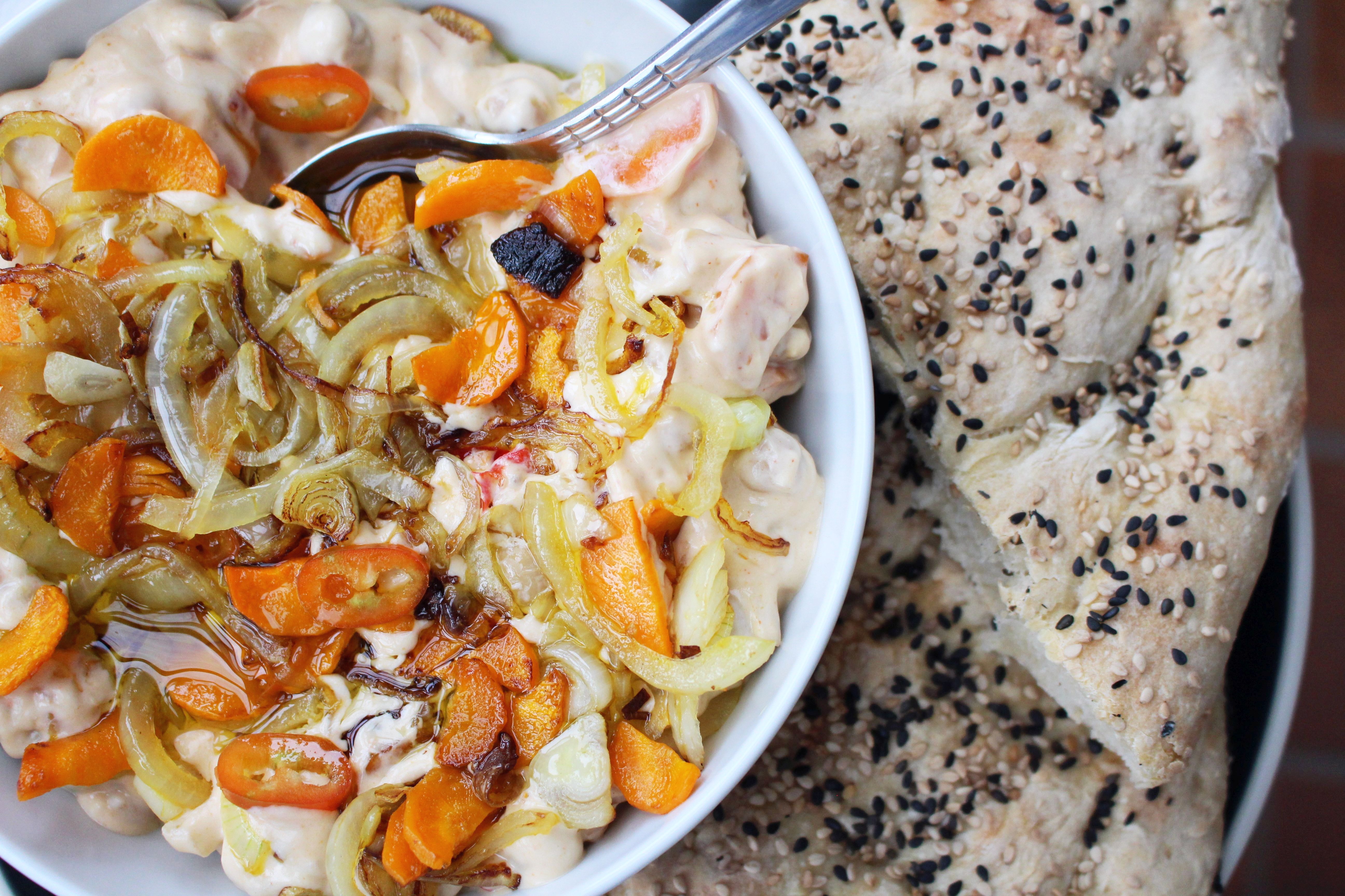 Unterdessen zwei Becher veganen, ungesüßten Naturjoghurt (insgesamt ca. 800g) in eine Schüssel füllen. Die Gemüsemischung (einschließlich des Öls) unterheben und alles zusammen mit Salz, ggf. weiterem Olivenöl nach Geschmack sowie einem Spritzer Zitronensaft abschmecken. Bis zum Servieren noch etwa 1-2 Stunden kaltstellen, dann mit etwas Fladenbrot servieren.