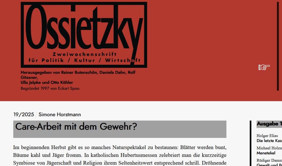 Allgemein Neu: „Care-Arbeit mit dem Gewehr?“ von Evergreenstories.de5. Oktober 2025 Kommentare 0 Ein kurzer, frisch erschienener Text über die Art und Weise, wie und warum sich Jäger als Tierfreunde gerieren – zu finden online in der Zeitschrift „Ossietzky“. Teilen mit: Klicke, um auf X zu teilen (Wird in neuem Fenster geöffnet) X Klick, um auf Facebook zu teilen (Wird in neuem Fenster geöffnet) Facebook Gefällt mir Wird geladen … 0 Kommentare zu “Neu: „Care-Arbeit mit dem Gewehr?“” Hinterlasse einen Kommentar Antwort abbrechen Δ Beitrags-Navigation Vorheriger Beitrag Nächster Beitrag