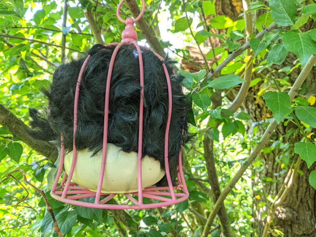 Während das Sommersemester langsam in seine heiße Phase übergeht und ich zugleich an einem größeren Artikel schreibe, plätschert der Alltag ungewohnt ruhig vor sich hin – alle Tiere sind gesund, und Hermes‘ Medikamente konnten wir nun endlich absetzen (seit der krassen Thrombozytopenie im Okt./Nov. vergangenen Jahres hatte er Cortison nehmen müssen, das wir nun sehr langsam und in immer kleiner werdenden Dosierungen ausgeschlichen haben). Etwas Neues gibt es aber doch: Friedwart hat eine neue, sommertaugliche Frisur. Die abrasierten Haare haben wir für die (spätbrütenden) Vögel zur Selbstbedienung in den Garten gehangen (s. Foto). Kurz darauf lese ich dann, dass man dies gar nicht tun sollte, weil sich Jungvögel an den längeren Haaren verletzten könnten. Also schnell wieder weg mit der haarigen Selbstbedienungstheke…