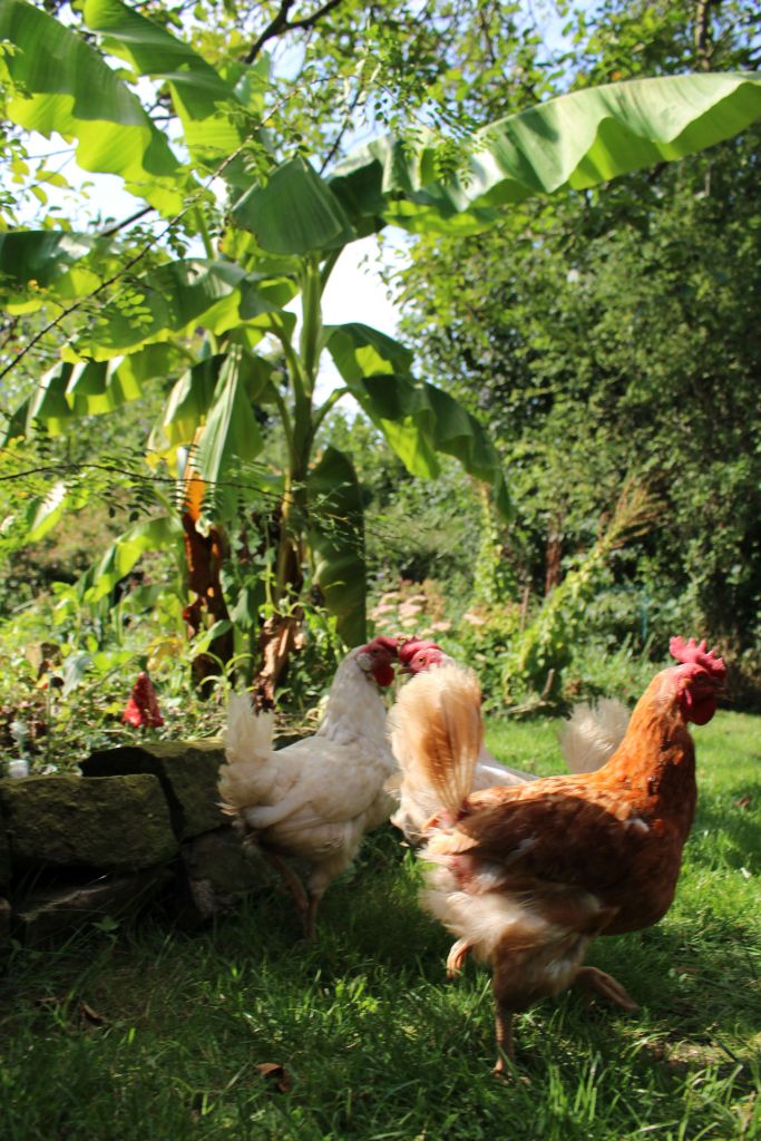 Am Wochenende sind vier Hennen eingezogen, zum Leidwesen der drei Hennen, die schon da waren und nun Haus, Hof und Garten teilen müssen. Man ist recht erbost. Aber das wird schon. Zwei der vier haben noch keinen Namen. Zwei der vier aber doch. Brunhild ist wehrhaft – den anderen Hennen gegenüber, mir gegenüber, und Abigail gegenüber. Allem, was ihr verdächtig scheint (die anderen Hennen, Abigail und ich) begegnet sie, indem sie erstmal drauflos pickt. Nicht richtig fies, aber deutlich genug. Ihr Gefieder war nicht so verdreckt wie das der anderen Hennen. Vermutlich hat sie sich in der grauseligen „Bodenhaltung“ gegenüber den anderen einigermaßen behaupten können und musste sich nicht auf die unteren Stangen zurückziehen. So konnte sie dem von oben herab fallenden Dreck ihrer Mitinsassinen entgehen. Anders die kleine Helena: Sie ist winzig, fast körperlich zurückgeblieben. Abgemagert und klapperdürr. Sie schreit aus voller Kehle, wenn die anderen sich ihr nähern, Ein Rätsel, dass sie überhaupt noch lebt. Die Tierindustrie weiß nun einmal, bis zu welchem Punkt sie die Tiere gnadenlos ausnutzen kann; bis auf die Minute scheint diese Nutzungsdauer vorausberechenbar. Effizienz, die das blecherne Bauernherz höherschlagen lässt. Was dann zurückbleibt, sind kleine klapperdünne Gespenster wie Helena, mehr Schatten als Huhn. Sie huscht vor allem weg, ist immer auf der Hut. Und sie ist aufmerksam: Seltsamerweise ist sie dann doch immer irgendwie in der Nähe, kommt sogar, wenn man sie leise ruft.