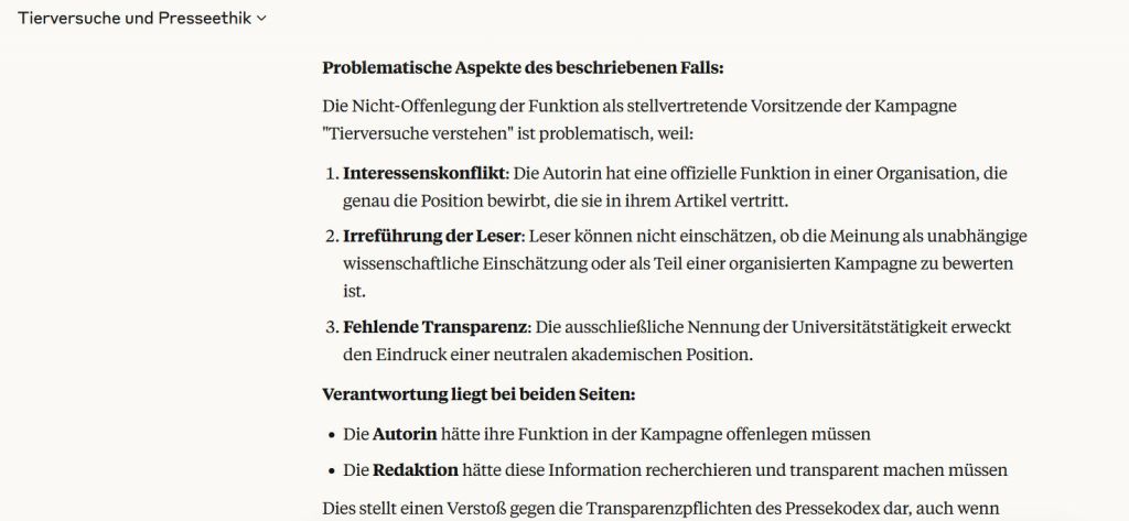 In der ZEIT durfte unlängst eine Funktionärin der Kampagne „Tierversuche verstehen“ einen Pro-Tierversuchs-Beitrag publizieren, ohne ihre Verbindung zu dieser Kampagne zu nennen. Auch die Redaktion hat es offenbar versäumt, hier kritisch nachzufragen. Anlass genug, eine kleine Diskussion mit der KI Claude zu führen 🙂