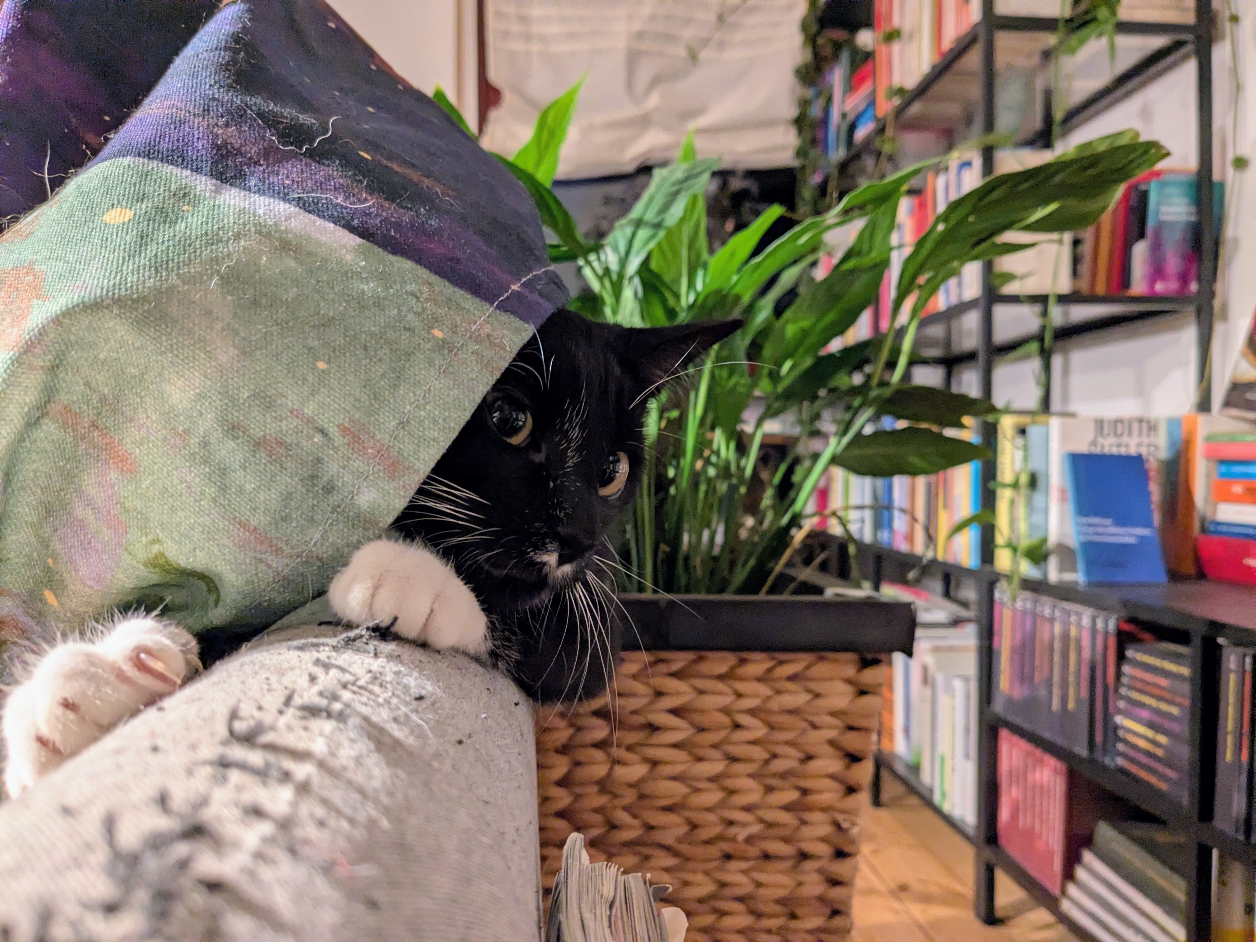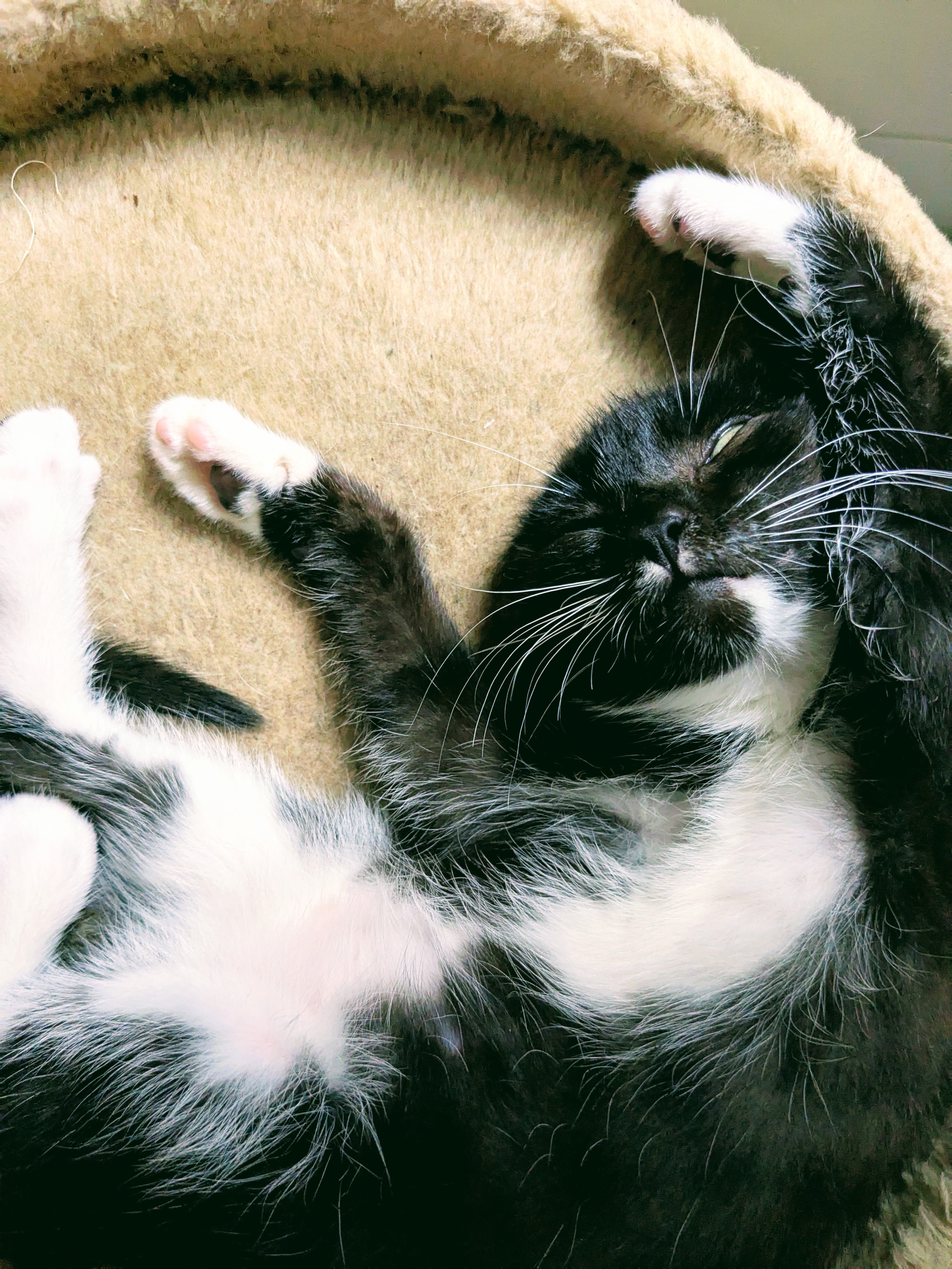 Roberta hat die Freuden des Krallenschärfens an heimischen Möbelstücken (und eigens dafür bereitgestellten Paketen) für sich entdeckt und reiht sich damit in die hiesige Tradition der feliden Zerstörungswut ein.