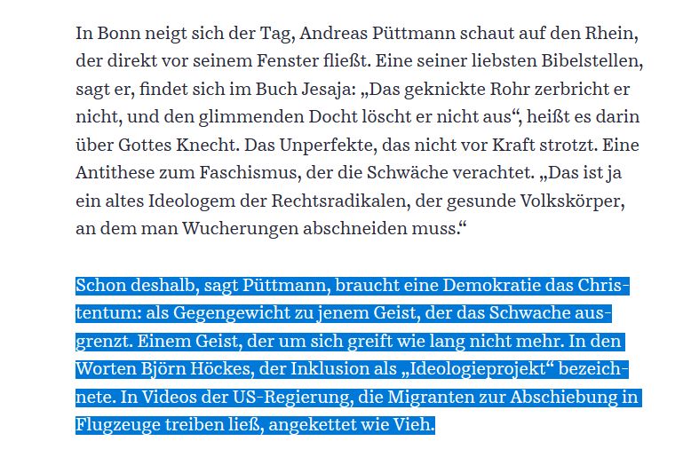 In der SZ heute ein Bericht über den Glaubenseinbruch in Deutschland, dazu Spekulationen über die Gründe und mehr oder weniger verzweifelte Appelle, dass Kirche und Glaube für das Funktionieren einer Demokratie unabdingbar seien. Darüber kann man streiten – der Versuch, Religion auf dem Weg funktionalistischer Notwendigkeitsbeschwörungen zu retten, dürfte dennoch ins Leere gehen. Schlimmer aber finde ich, dass hier wieder einmal zwei Dinge vermengt werden: Man betont, dass Religion ein Gegengewicht zu gewaltätigen Ideologien sei (was auch nur zum Teil stimmen dürfte, wenn man an die enormen Schnittmengen der kath. Kirche mit rechten Kreisen und zuletzt auch die regelrechte kirchliche Hetze gegen Fr. Brosius-Gersdorf denkt), und zugleich bedient man sich nichtsdestotrotz dann gleich selbst einer tierfeindlichen Ideologie, um diese vermeintliche Ideologiekritik zu äußern. Wer Ideologien nur zurückweisen kann, in dem er/sie neue Opfer produziert, ist wohl selbst ideologisch-verbrämter, als ihm/ihr lieb sein dürfte.