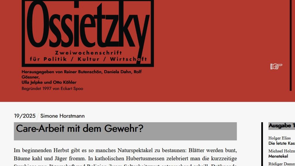 von Evergreenstories.de 5. Oktober 2025 Anzahl der Kommentare0 Allgemein Neu: „Care-Arbeit mit dem Gewehr?“ Ein kurzer, frisch erschienener Text über die Art und Weise, wie und warum sich Jäger als Tierfreunde gerieren – zuweiterlesen